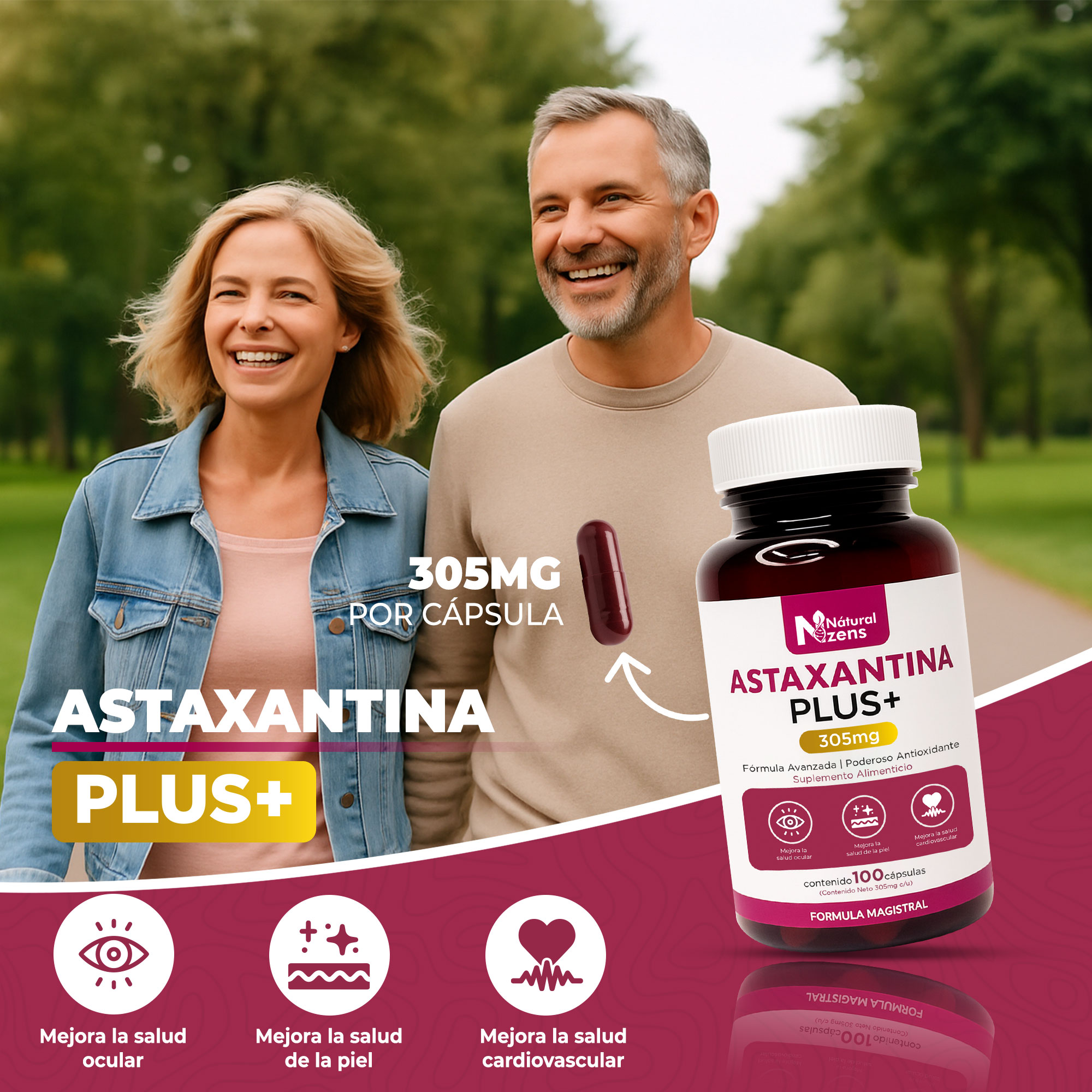 Es un suplemento nutracéutico formulado con astaxantina de origen natural, reconocida por su potente acción antioxidante. La piperina contribuye a optimizar la biodisponibilidad de los compuestos activos.